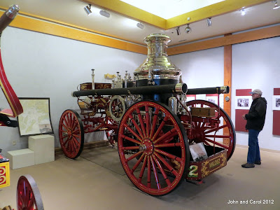 Today, we visited the Valdez Museum. It traces the history of the area, from native peoples several thousand years ago to the Exxon Valdez oil spill in 1989. These two pieces of fire-fighting apparatus were used in the early days of the city of Valdez. The first is a handpumped fire engine purchased used in 1902. The second is 1907 Ahrens steam fire engine purchased new.