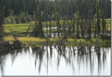 What did we relish during our trip today? There were numerous ponds and small lakes. This country, which often sits on permafrost, has innumerable such ponds. Often they are smooth and reflect the surroundings. This first picture shows a trumpeter swan floating on the lake, though I don’t know if you can make it out. A little later, we saw two of these swans flying overhead. How cool is that? Where else could we see that?