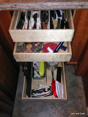 Santa came to our house on Monday. I guess people over the age of 60 are practical folks. We didn't get a toilet like Barbara and Ron or an ipad like Jim and Gayle. We had planned to get a new mattress for Christmas. That is until our neighbor Vern volunteered to build some drawers for our kitchen. If you remember, we moved into this new Mobile Suites in October and discovered there were no drawers in the kitchen. Since Santa's visit, that has been corrected.